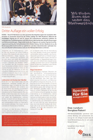 Rund 30 Teilnehmer aus dem gesamten Bundegebiet tagten bei nasskaltem Winterwetter im hessischen Kassel zur dritten Auflage der DIE6-Akademie. Während der zweitägigen Tagung am 24. Und . 25. Januar 2014 präsentierten zahlreiche Zulieferer ihr umfangreiches Produktprogramm und informierten gleichzeitig über aktuelle Neuerungen und Weiterentwicklungen. Abgerundet wurde das Programm am zweiten Tag durch ein Managementcoaching des renommierten Verkaufstrainers Erich-Nobert Detroy. Ziel der Akademien ist es, die Beratungsqualität kontinuierlich zu optimieren und dem Industriekunden optimalen Service und aktuelle Fachkompetenz rund um den Werbeartikel bieten zu können, dafür steht der Werbemittelverbund DIE6.