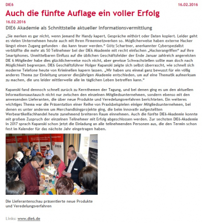 Ein weiteres wichtiges Thema war die Präsentation einer Reihe von Praxisbeispielen einiger Mitgliedsunternehmen, bei denen es unter anderem um Merchandisingprojekte ging, die beim innovativ aufgestellten Werbeartikelfachhandel heute zunehmend breiteren Raum einnehmen. Auch die fünfte DIE6-Akademie konnte mit großem Zuspruch der einzelnen Teilnehmer mit Erfolg abgeschlossen werden. Zur sechsten DIE6-Akademie in 2017 sprach Kapanski schon jetzt die Einladung an alle teilnehmenden Personen aus, die den Termin schon fest im Kalender für das nächste Jahr eingetragen haben.
