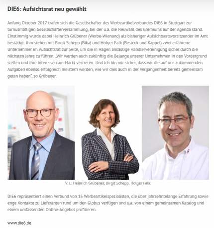 Anfang Oktober trafen sich die Gesellschafter turnusmäßig zur Neuwahl des Gremiums in Stuttgart zur Gesellschafterversammlung, bei der u.a. die Neuwahl des Gremiums auf der Agenda stand. Einstimmig wurde dabei Heinrich Grübener (Werbe-Wienand) als bisheriger  Aufsichtsratsvorsitzender bestätigt. Ihm stehen mit Birgit Schepp (Bika) und Holger Falk (Besteck und Kappel) zwei erfahrene Unternehmer im Aufsichtsrat zur Seite, um die in Hagen ansässige Händlervereinigung sicher durch die nächsten Jahre zu führen. "Wir werden auch zukünftig die Belange unserer Unternehmen in den Vordergrund stellen und ihre Interessen am Markt vertreten. Und ich bin mir sicher, dass wir die auf uns zukommenden Aufgaben ebenso erfolgreich meistern werden wie wir dies auch in der Vergangenheit bereits gemeinsam getan haben.“, so Grübener.
