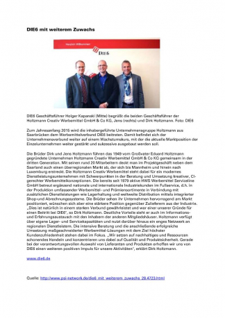 Zum Jahresanfang 2015 wird die inhabergeführte Unternehmensgruppe HOLTZMANN aus der saarländischen Landeshauptstadt Saarbrücken dem Werbemittelverbund DIE6 beitreten. Damit befindet sich der Unternehmensverbund weiter auf einem kontrollierten Wachstumskurs, mit der die aktuelle Marktposition der Einzelunternehmen weiter gestärkt und sukzessive ausgebaut werden soll.
