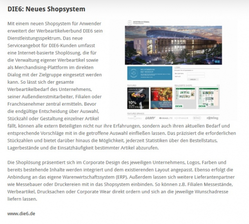 Mit ihrer neuen DIE6-Shoplösung dokumentieren die Werbemittelspezialisten einmal mehr, dass der Kunde bei ihnen im Mittelpunkt des Handelns steht. Individueller Service ist für die 16 bundesweit agierenden Mitgliedsunternehmen kein werbewirksames Lippenbekenntnis, sondern vielmehr Bestandteil einer serviceorientierten Unternehmensphilosophie. Entsprechend benutzerfreundlich präsentiert sich die neue DIE6-Shoplösung, die völlig neue Möglichkeiten auch bei der direkten Kundenansprache eröffnet und gleichzeitig Personal und Zeit einspart.