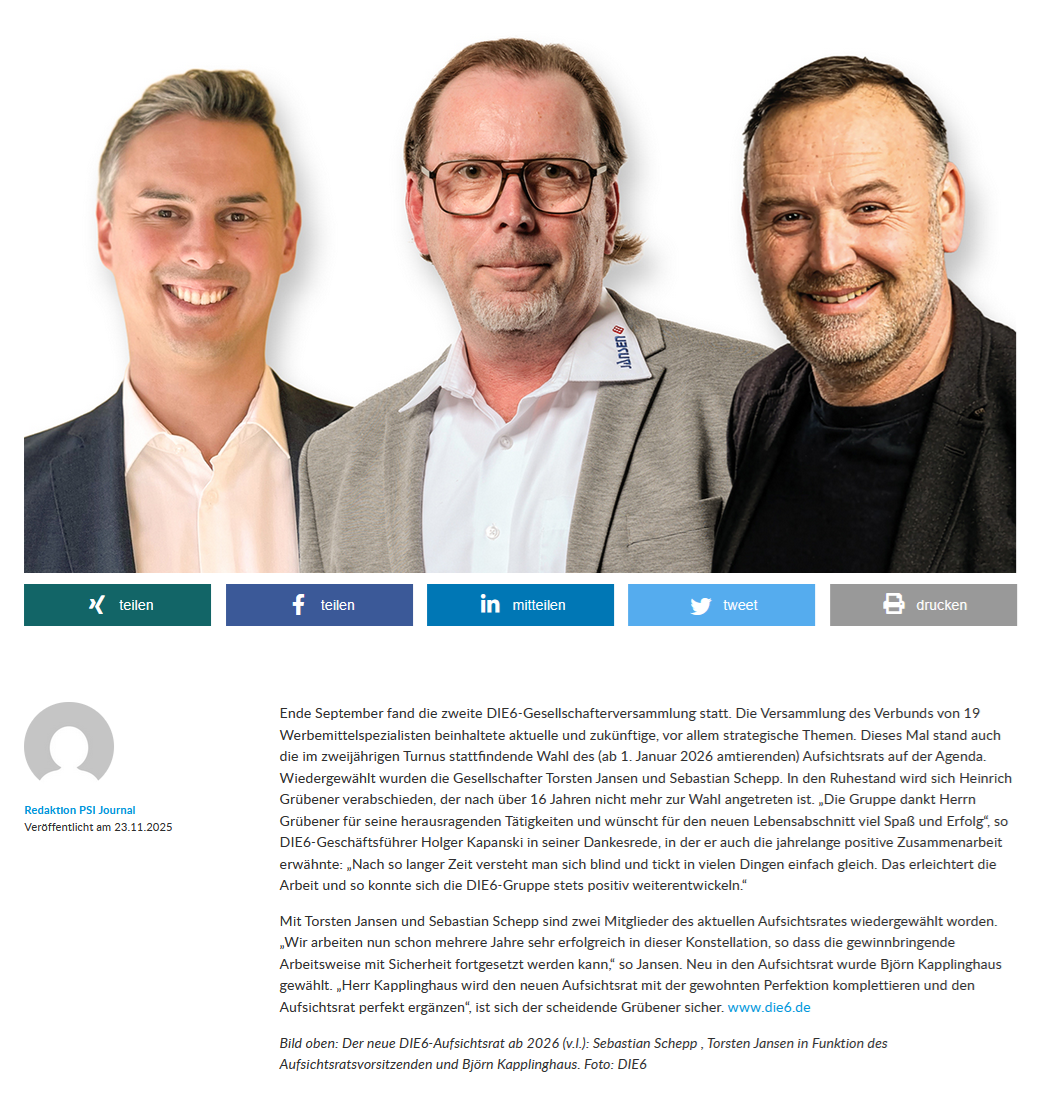 Im DIE6-Pressearchiv finden Sie zahlreiche Artikel und Informationen vom und über das Profi-Netzwerk der Werbeartikel-Unternehmer.