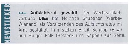 Im DIE6-Pressearchiv finden Sie zahlreiche Artikel und Informationen vom und über das Profi-Netzwerk der Werbeartikel-Unternehmer.