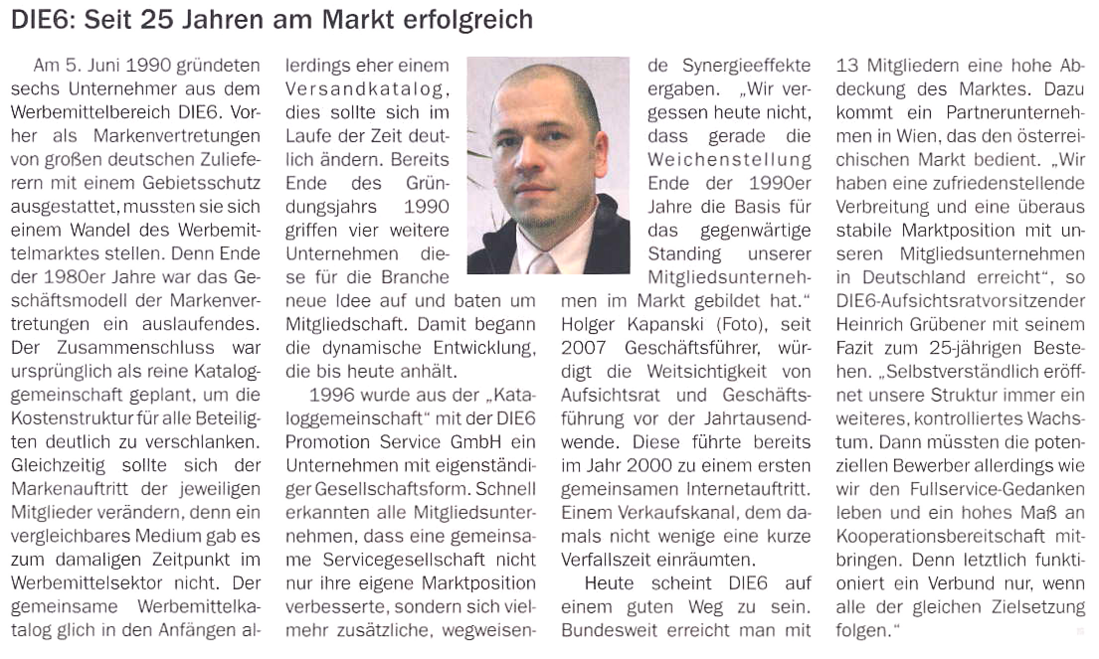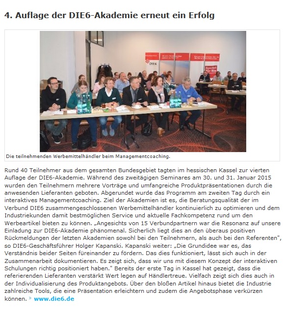 Im DIE6-Pressearchiv finden Sie zahlreiche Artikel und Informationen vom und über das Profi-Netzwerk der Werbeartikel-Unternehmer.