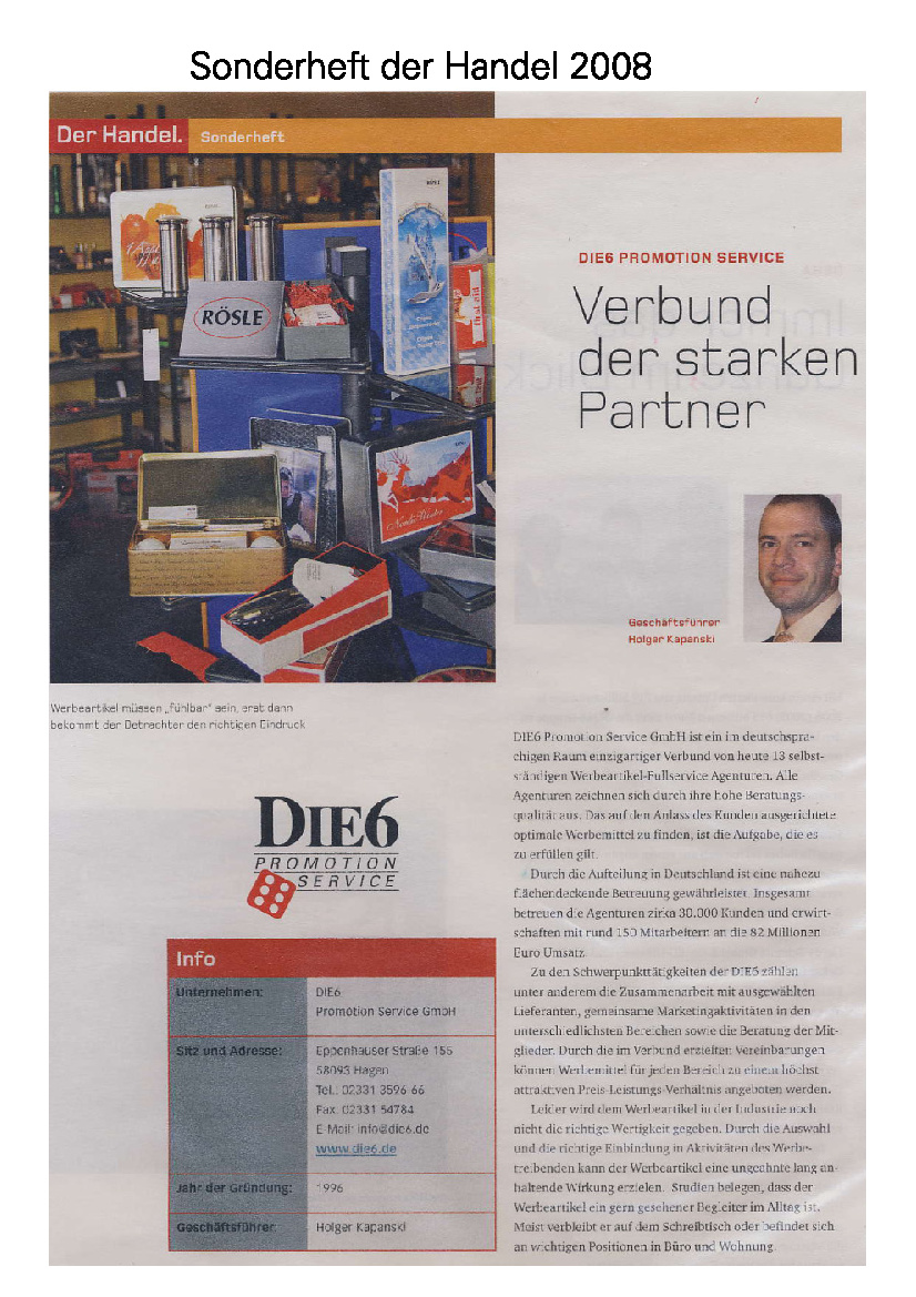 Im DIE6-Pressearchiv finden Sie zahlreiche Artikel und Informationen vom und über das Profi-Netzwerk der Werbeartikel-Unternehmer.